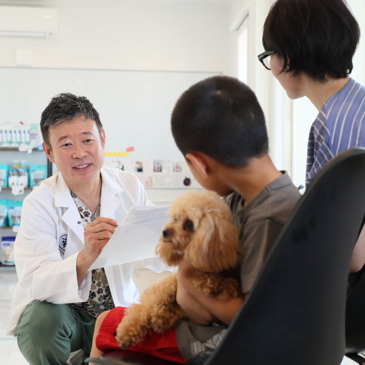 その実現のためには、オーナー様とのコミュニケーションがとても大切で、動物たちの様子や変化、普段の生活状況などを伺いながら診療を行っています。